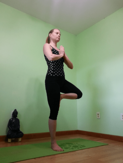 Start in Mountain pose and as with all balance poses start to notice how you are standing on your feet. Be sure to stand evenly on your foot. Check the four corners of the foot (see the blog about Eagle pose on where the corners are located). If you are having a difficult time getting to the four corners of the feet slowly lift the toes upwards . This will put you onto the four corners. When you are ready make sure the toes are one the mat and not scrunched up. Start to feel rooted into the floor with the right foot. Slowly start to lift the left foot off the ground and start to turn the left leg out to the side. The hips are open in this pose. Where you bring the sole of the foot depends on your balance. You can place the foot on the ankle, shin, or thigh. Try not to place the foot against the side of the knee. You don’t want to press on that area. The higher the foot placement the more difficult balance will be. If you are able to place the foot against the inner thigh you will need to help place it there with your hand.